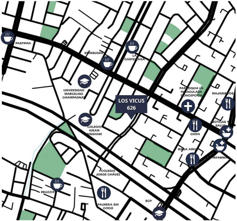 Vicus está ubicado en una zona estratégica, rodeado de universidades, colegios, parques, restaurantes y centros de salud.